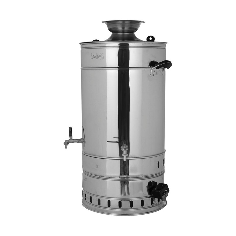 سماور هاى گازى از ٦٠ ليتر به بالا بخاطر سنگينى و خطر جابجايي سماور بايد داراى فوليتر وصل به اب شهرى باشد و همچنين فوليتر متصل به اب شهر باعث ميشود عمر سماور طولانى شود و سماور بدون اب نماند. بدون اب ماندن سماور باعث ميشود حرارت شعله نيكل و كروم سماور را از بين برده و تبديل به ورق اهن شود و اكسيد شود و بپوسد. داراى شعله پخش كن ٢٥و شير ورودى گاز برنجى و استاندارد. سماور تک شیر می باشد. دسته هاى سماور از جنس باكاليت نسوز. داراى شير برنجى مخصوص ابگرم. سماور تماما با جوش آرگون جوش داده شده است. |
