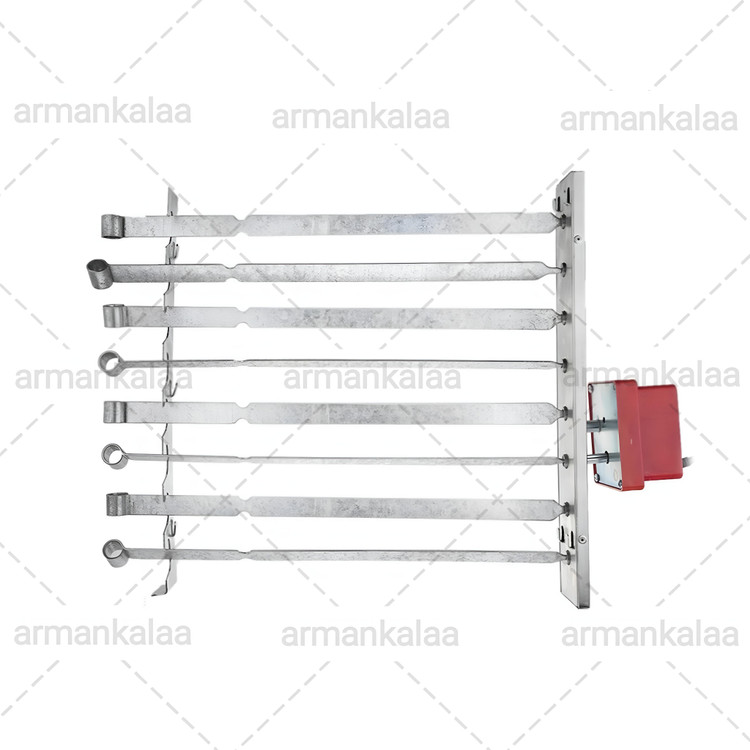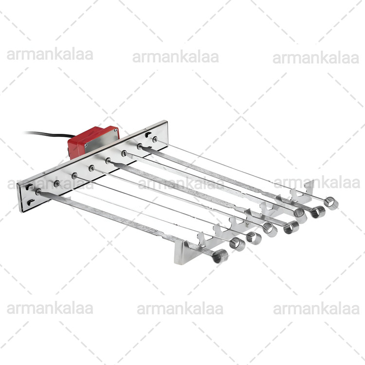 دستگاه سیخ گردان امکان چرخش همزمان 8 عدد سیخ حول محور خود و مقابل زون تابشی کباب پر را امکان پذیر می کند . این دستگاه قابل نصب بر روی کباب پز های ضیافت مدل تابش و شعله می باشد.