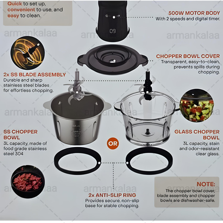 این خردکن با طراحی مدرن و رنگ مشکی، فضای کمی اشغال میکند و برای آشپزخانههای کوچک هم مناسب است. دستگاه همراه با دو ظرف 3 لیتری، یکی شیشه پیرکس و دیگری استیل ضدزنگ ارائه میشود که برای حجم زیاد مواد و خانوادههای پرجمعیت بسیار کاربردی است. وجود حلقه ضدلغزش زیر کاسهها باعث ثبات بیشتر دستگاه میشود.