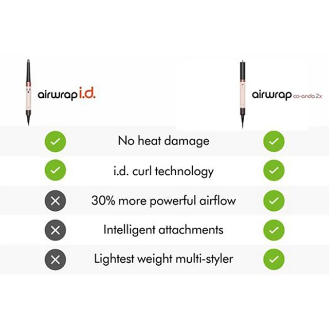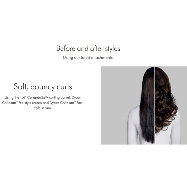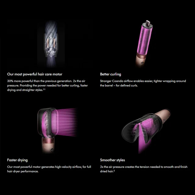 - فناوری تقویت شده Co-anda2X بدون حرارت آسیبزا: استفاده از جریان هوای منحنی اثر Coanda با شدت 2 برابری در مقایسه با نسل قبلی Dyson Airwrap ها، برای کشیدن مو به سمت سری و حالتدهی طبیعی بدون استفاده از حرارت بالا و بدون به کار بردن سری های فلزی، که باعث محافظت از سلامت موی شما میشود.