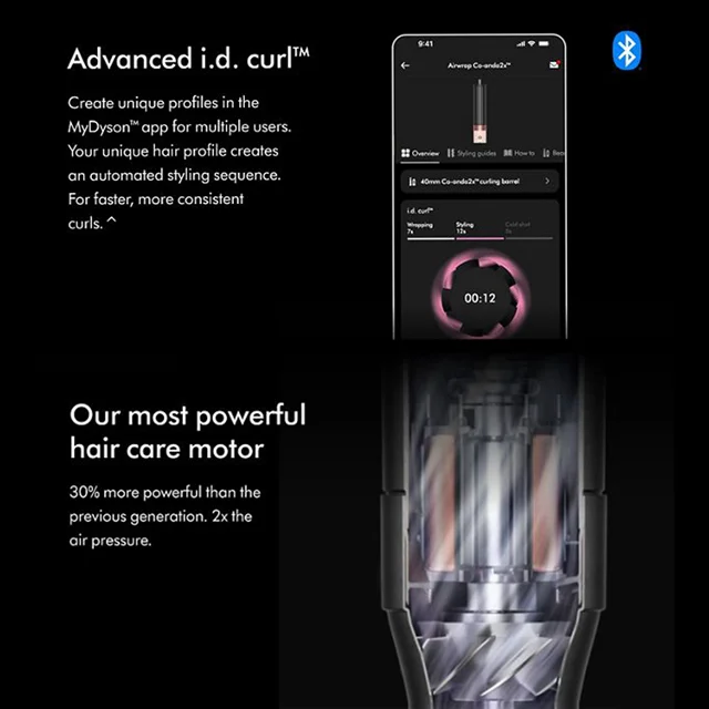 - دارای قابلیت هوش مصنوعی در حالتدهی: برای اولین بار، Dyson Airwrap به کمک اپلیکیشن MyDyson و اتصال بلوتوث به آن، تنظیمات شخصیسازیشده شامل نوع مو، جهت چرخش، دما و زمان را ذخیره و اجرا میکند و در این نسل جدید Airwrap Co-anda2X بازدهی و دقت این تکنولوژی بالاتر هم رفته.