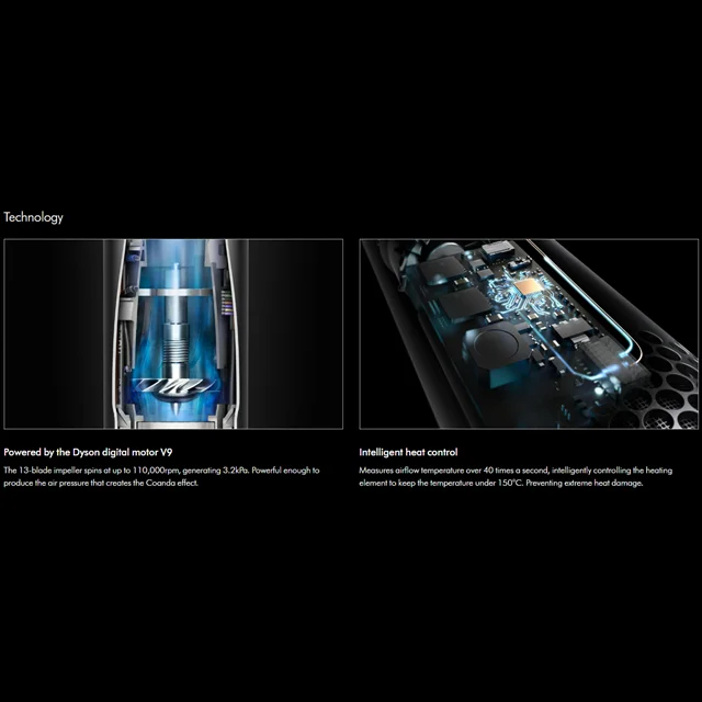 - موتور دیجیتال Dyson V۹:یک موتور بسیار کوچک، سبک و قدرتمند که تا ۱۱۰٬۰۰۰ دور در دقیقه میچرخد و جریان هوای دقیق و متمرکز ایجاد میکند.
