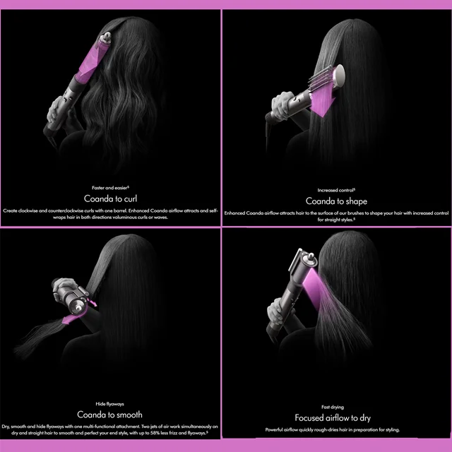 - فناوری Coanda بدون حرارت آسیبزا: استفاده از جریان هوای منحنی اثر Coanda برای کشیدن مو به سمت سری و حالتدهی طبیعی بدون استفاده از حرارت بالا و بدون به کار بردن سری های فلزی، که باعث محافظت از سلامت موی شما میشود.