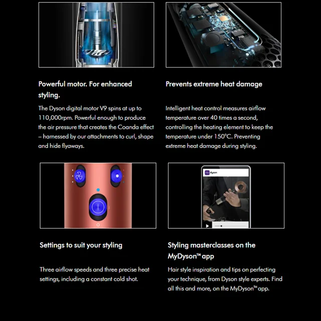 - موتور دیجیتال Dyson V۹:یک موتور بسیار کوچک، سبک و قدرتمند که تا ۱۱۰٬۰۰۰ دور در دقیقه میچرخد و جریان هوای دقیق و متمرکز ایجاد میکند.