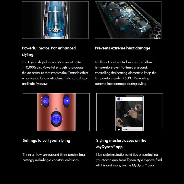 - سریهای متنوع قابل چرخش دو جهته برای استایل کردن طبیعی تر:سریهای Airwrap بهراحتی میتوانند با حرکت یک دکمه، جهت چرخش را تغییر دهند؛ نیازی به تعویض سری برای تغیر جهت فر نیست.
