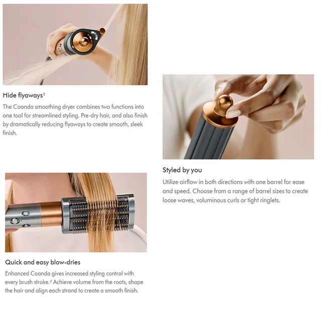 - سریهای متنوع قابل چرخش دو جهته برای استایل کردن طبیعی تر:سریهای Airwrap بهراحتی میتوانند با حرکت یک دکمه، جهت چرخش را تغییر دهند؛ نیازی به تعویض سری برای تغیر جهت فر نیست.