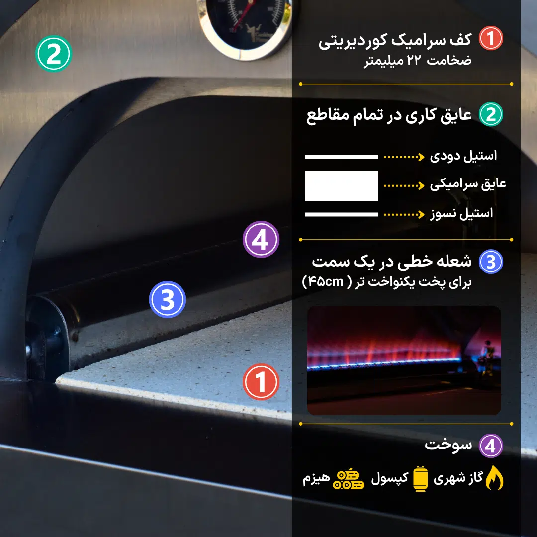 کف سرامیکی کوردیریتی با ضخامت ۲۲ میلیمتر، حرارت را بهخوبی حفظ میکند و پخت سریع و یکنواخت پیتزا و نانهای حجیم را تضمین مینماید.