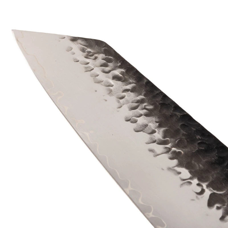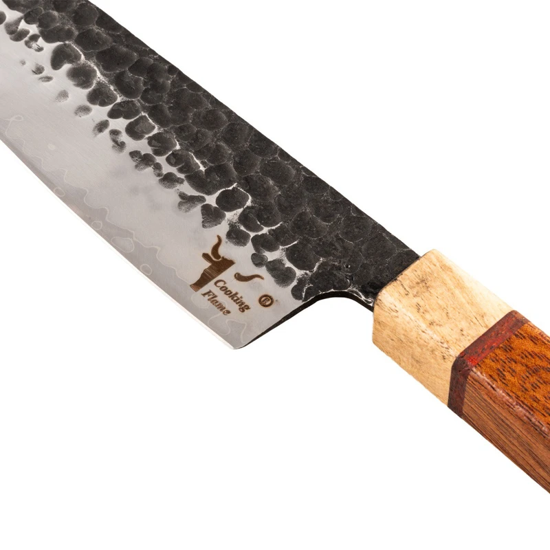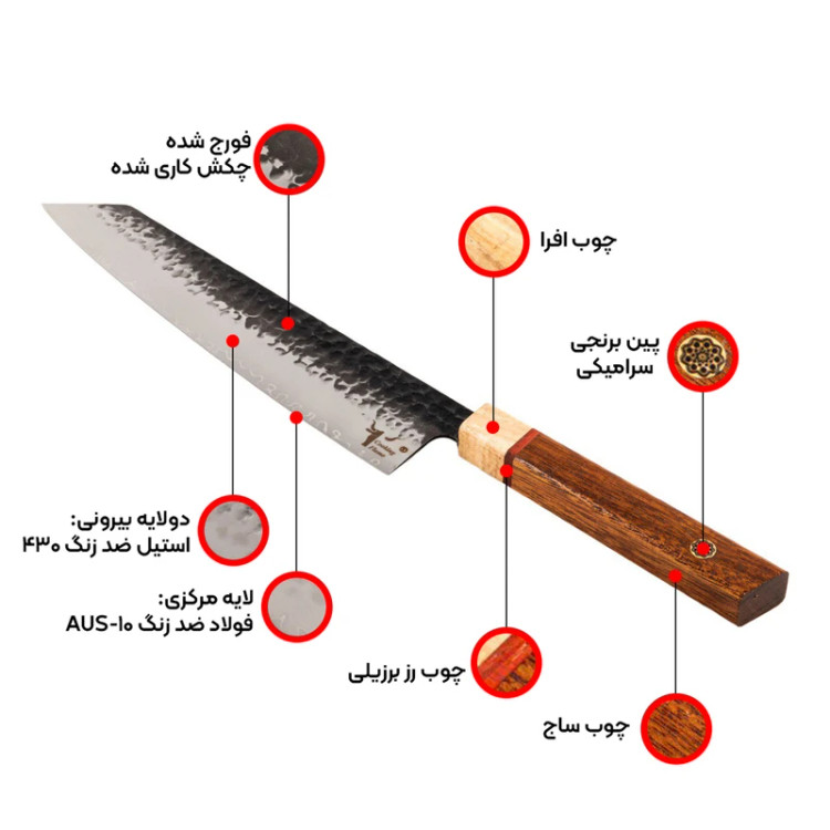چاقو آشپزخانه کوکینگ فلیم مدل San Mai 3 از یک لایه سخت مرکزی با تیغه فولادی ژاپنی AUS-10 و طراحی دو لایه استیل ۴۳۰ در دو طرف هسته یکی از بهترین انتخابها برای کافهها، رستورانها و هتلها است. این چاقو به دلیل ترکیب ویژگیهای برجسته و کیفیت عالی، ابزاری بینظیر برای سرآشپزان حرفهای و علاقهمندان به آشپزی است. ویژگیهای چاقو آشپزخانه کوکینگ فلیم مدل San Mai 3: - تیغه فولادی ژاپنی AUS-10 با سختی 60 HRC: فولاد AUS-10 که از معتبرترین فولادهای ژاپنی است، ترکیب میشود تا چاقویی با لبهای بسیار تیز و مقاوم در برابر فرسایش تولید کند. این ویژگی باعث میشود که چاقو تا مدتها تیز بماند و نیاز به تیز کردن مکرر نداشته باشد. - دو لایه استیل ۴۳۰ برای افزایش انعطافپذیری: دو لایه استیل علاوه بر افزایش مقاومت در برابر خوردگی و سایش، به چاقو انعطافپذیری بالایی میبخشد و به راحتی میتوانید از آن برای انواع کارهای آشپزی استفاده کنید. - مقاومت در برابر زنگ زدگی و سایش: ترکیب کروم، مولیبدن و وانادیوم در فولاد AUS-10، مقاومت بالای چاقو در برابر خوردگی و زنگ زدگی را تضمین میکند و دوام و عمر مفید طولانی را برای استفادههای روزمره در رستورانها، کافهها و هتلها فراهم میآورد. - عملیات فورج برای بهبود عملکرد: چاقوی سان مای با عملیات چکشکاری به دقت و زیبایی ساخته میشود که علاوه بر ظاهر جذاب، سختی و عملکرد بهتری نیز به چاقو میبخشد. این عملیات کمک میکند که مواد غذایی به راحتی از سطح تیغه جدا شوند. دسته چوبی: دسته چاقو از ترکیب چوب ساج آفریقایی، رز برزیلی و افرا با کیفیت بالا و مقاومت عالی در برابر مواد خوراکی، اسیدها و قارچها ساخته شده است.این چوب ها جزو چوب های گران قیمت در جهان هستند که دسته لایق این تیغه را به وجود آورده اند. دسته چوبی 8 ضلعی علاوه بر حفظ اصالت چاقوهای ژاپنی دارای استحکام بالایی هستند که تجربهای راحت و ارگونومیک برای کاربر به ارمغان میآورد و در استفادههای طولانیمدت خستهکننده نمیشود. مزایای استفاده برای کافهها و رستورانها: - عملکرد بینظیر در محیطهای پر استفاده: - سهولت استفاده و ارگونومی عالی: - مقاومت در برابر شرایط سخت آشپزی - ظاهر شیک و جذاب - مناسب برای خرد کردن، برش زدن و چاکزنی انواع مواد غذایی از جمله گوشت، ماهی، سبزیجات و میوهها.