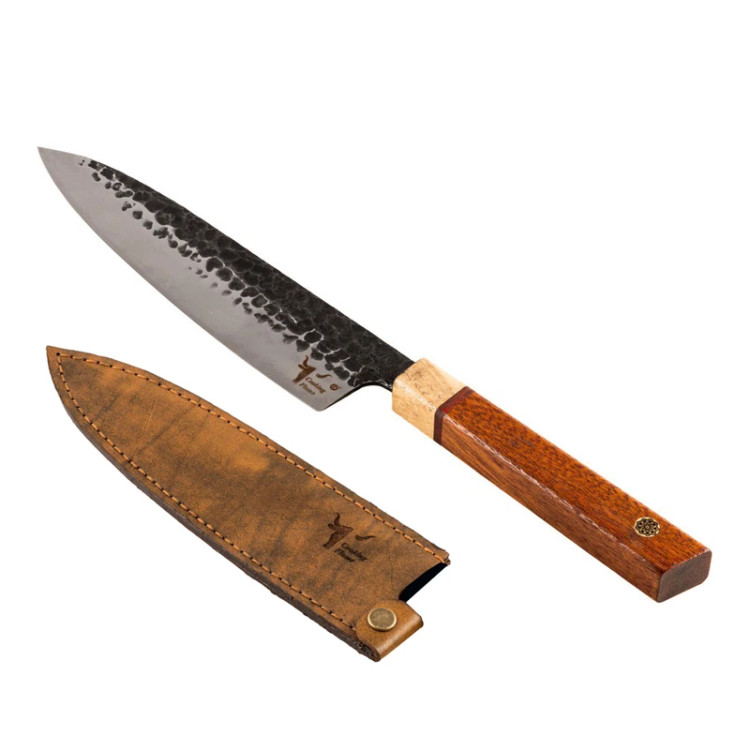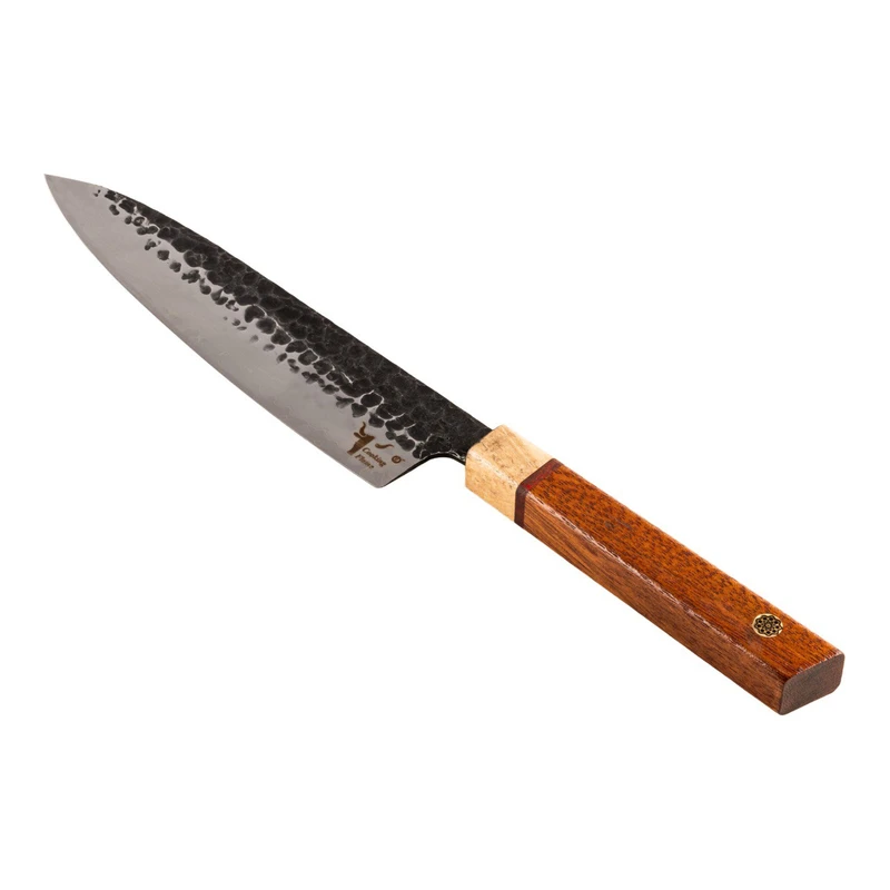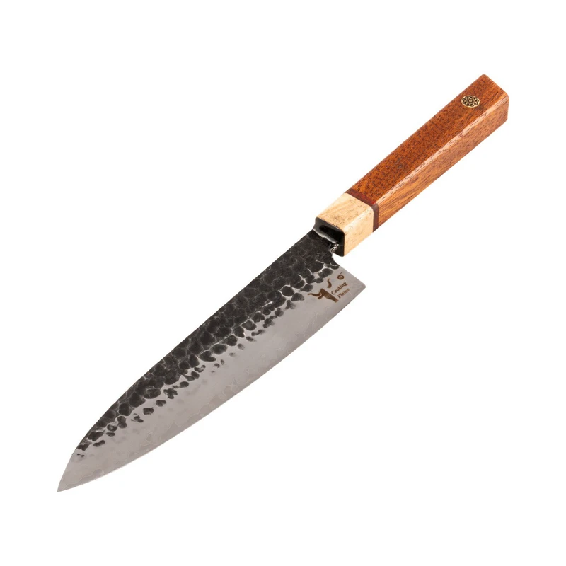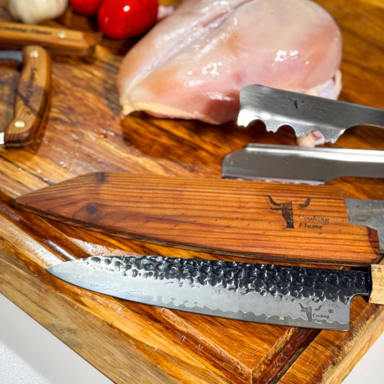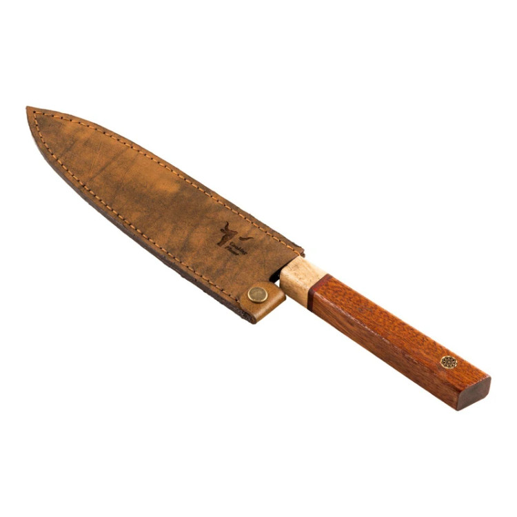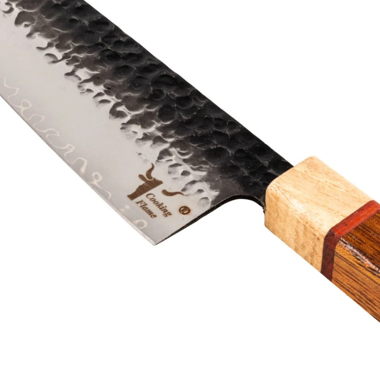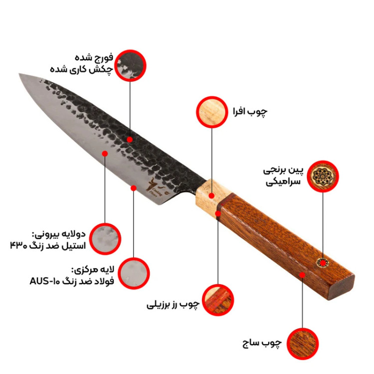 چاقو آشپزخانه کوکینگ فلیم مدل San Mai 2 از یک لایه سخت مرکزی با تیغه فولادی ژاپنی AUS-10 و طراحی دو لایه استیل ۴۳۰ در دو طرف هسته یکی از بهترین انتخابها برای کافهها، رستورانها و هتلها است. این چاقو به دلیل ترکیب ویژگیهای برجسته و کیفیت عالی، ابزاری بینظیر برای سرآشپزان حرفهای و علاقهمندان به آشپزی است. ویژگیهای چاقو: - تیغه فولادی ژاپنی AUS-10 با سختی 60 HRC: فولاد AUS-10 که از معتبرترین فولادهای ژاپنی است، ترکیب میشود تا چاقویی با لبهای بسیار تیز و مقاوم در برابر فرسایش تولید کند. این ویژگی باعث میشود که چاقو تا مدتها تیز بماند و نیاز به تیز کردن مکرر نداشته باشد. - دو لایه استیل ۴۳۰ برای افزایش انعطافپذیری: دو لایه استیل علاوه بر افزایش مقاومت در برابر خوردگی و سایش، به چاقو انعطافپذیری بالایی میبخشد و به راحتی میتوانید از آن برای انواع کارهای آشپزی استفاده کنید. - مقاومت در برابر زنگ زدگی و سایش: ترکیب کروم، مولیبدن و وانادیوم در فولاد AUS-10، مقاومت بالای چاقو در برابر خوردگی و زنگ زدگی را تضمین میکند و دوام و عمر مفید طولانی را برای استفادههای روزمره در رستورانها، کافهها و هتلها فراهم میآورد. - عملیات فورج برای بهبود عملکرد: این چاقو با عملیات چکشکاری به دقت و زیبایی ساخته میشود که علاوه بر ظاهر جذاب، سختی و عملکرد بهتری نیز به چاقو میبخشد. این عملیات کمک میکند که مواد غذایی به راحتی از سطح تیغه جدا شوند. دسته چوبی: دسته چاقو از ترکیب چوب ساج آفریقایی، رز برزیلی و افرا با کیفیت بالا و مقاومت عالی در برابر مواد خوراکی، اسیدها و قارچها ساخته شده است.این چوب ها جزو چوب های گران قیمت در جهان هستند که دسته لایق این تیغه را به وجود آورده اند. دسته چوبی 8 ضلعی علاوه بر حفظ اصالت چاقوهای ژاپنی دارای استحکام بالایی هستند که تجربهای راحت و ارگونومیک برای کاربر به ارمغان میآورد و در استفادههای طولانیمدت خستهکننده نمیشود. غلاف چرمی: ساخته شده از چرم طبیعی گاو و دست دوز شده. مزایای استفاده برای کافهها و رستورانها: - عملکرد بینظیر در محیطهای پر استفاده - سهولت استفاده و ارگونومی عالی - مقاومت در برابر شرایط سخت آشپزی - ظاهر شیک و جذاب - مناسب برای خرد کردن، برش زدن و چاکزنی انواع مواد غذایی از جمله گوشت، ماهی، سبزیجات و میوهها