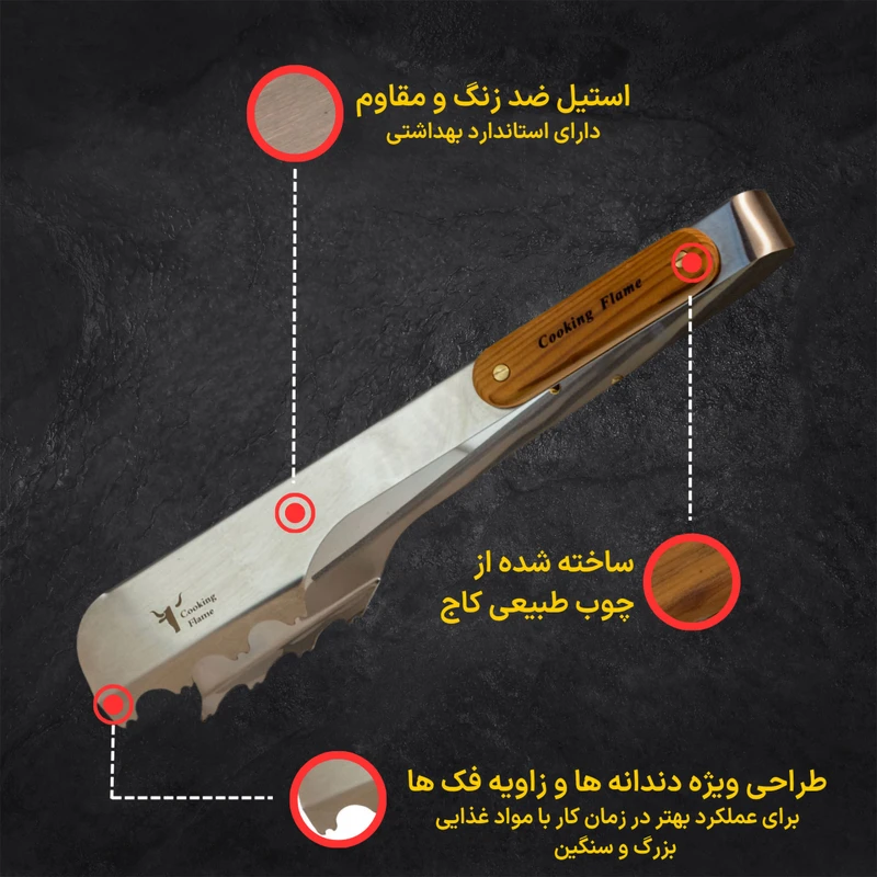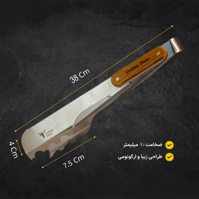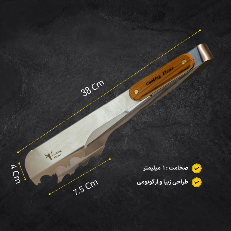 وسایل آشپزی علاوه بر کیفیت باید زیبا نیز باشند انبر «Cooking flame» (کوکینگ فلیم) مدل «kq 40» برای جابجایی و برگرداندن گوشت، همبرگر، سوسیس یا سایر مواد غذایی روی باربیکیو یا کبابپز کاربرد دارد انبرهای زیادی وجود داردند اما این انبر چنگالهای بزرگ و دسته بلندی دارد که به هنگام طبخ به آشپز کمک میکند با فاصله زیاد از باربیکیو کار کند و همچنین بهعلت دارا بودن چنگالهای بزرگ و محکم ، جابجای قطعات بزرگ را برایتان آسانمیکند؛ بهاینترتیب هنگام کباب کردن انواع مواد غذایی روی باربیکیو، این انبر کارایی فراوانی خواهد داشت. همانطوری که در تصاویر دیده میشود، بدنهی انبر بهطور کامل از استیل ضد زنگ ساخته شده است تا در برابر حرارت و گرمای باربیکیو، مقاومت و استحکام خوبی داشته باشد . دو قطعهی چوب کاج که در دو طرف انبر نصب شدهاند، از سوختن دست هنگام لمس انبر جلوگیری خواهند کرد. این تکههای چوبی مانع انتقال گرما و داغی انبر به انگشتان دست خواهند شد. با نگاهی دوباره به تصاویر مشاهده خواهید کرد که لبههای انبر به شکل خاصی طراحی شده است که به شما این امکان را میدهند که با کمترین نیرو بهترین عملکرد را داشته باشید این دندانهها با گرفتن مواد غذایی بزرگ و کوچک، از افتادن آنها از روی باربیکیو جلوگیری خواهند کرد. این مدل از کیفیت مطلوبی برخوردار است و هنگام کباب کردن انواع خوراکیها و غذاهای خوشمزه روی کبابپز یا باربیکیو، به کارتان خواهد آمد.