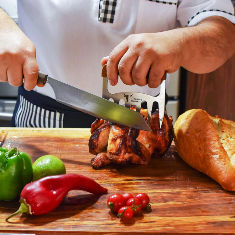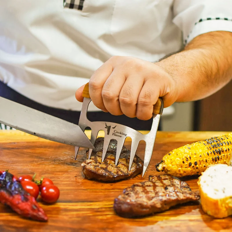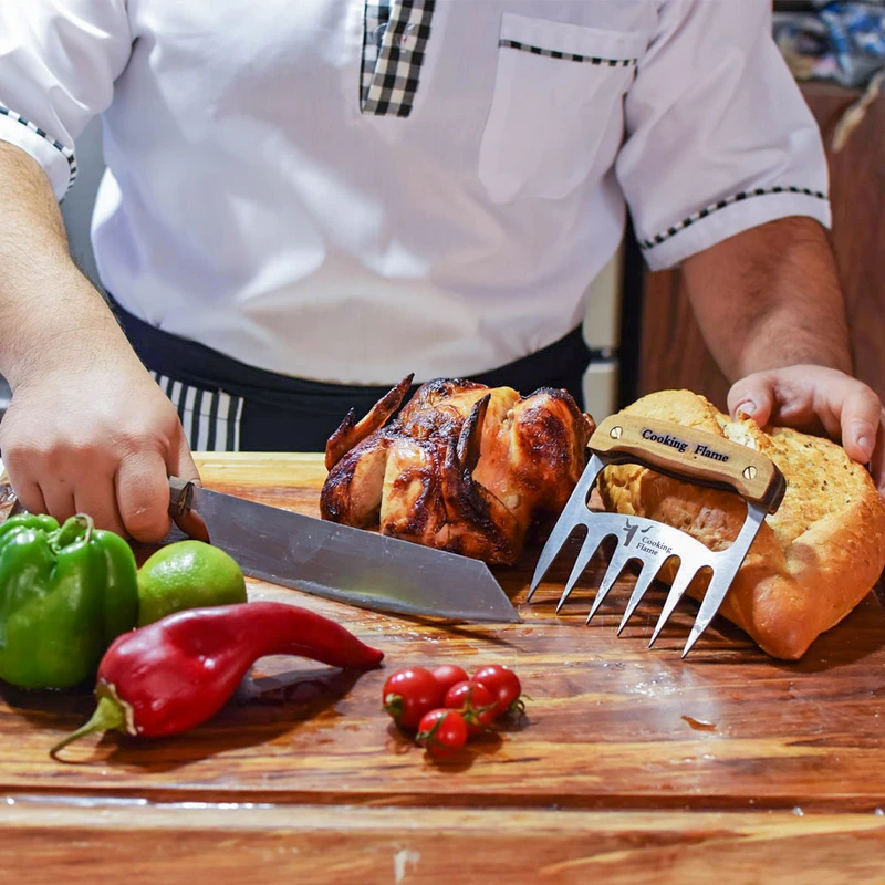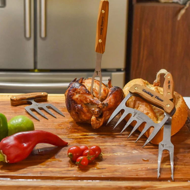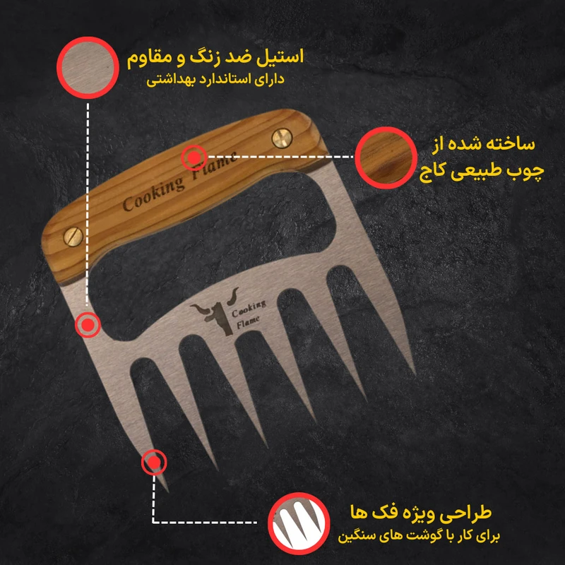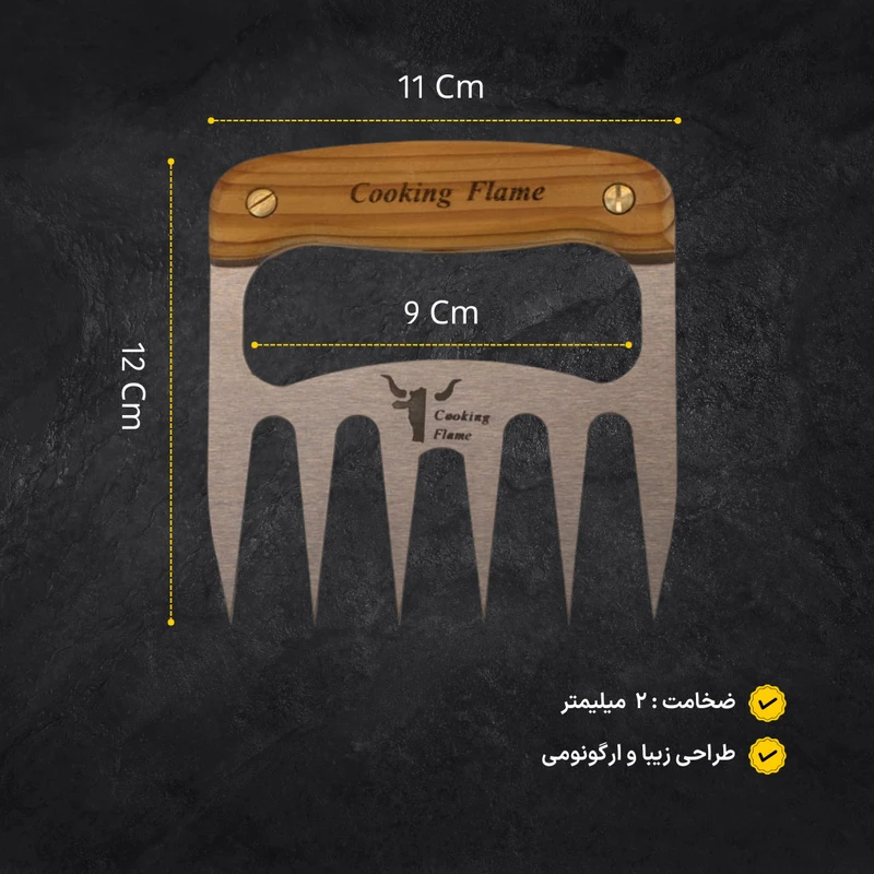 یکی از ابزارهای سرو چنگال های سرو استیک ، مرغ و گوشت برند کوکینگ فلیم است. این مدل مناسب سرو گوشتهای سفت مثل قطعات گوشت دارای استخوان است. زمانی که میهمانان دور میز ناهارخوری نشسته اند. بی شک، نحوه پذیرایی، سرو و اجرای مراسم شام، از دید تعداد زیادی از مردمانی که به زندگی لاکچری علاقه دارند؛ بسیار مهم است. این ابزار بی نظیر و عالی، به شما کمک می کند تا با نهایت اطمینان و خونسردی، زیباترین سرو را داشته باشید. تیغه محصول از استیل ضد زنگ ساخته شده که تا سال ها به خوبی روز اول کار میکند. جنس: دسته ازچوب کاج می باشد که به لطف ساخت دسته با این نوع متریال و هارمونی مناسب تیغه و دسته، قابلیت هندلینگ بسیار ایمن، جلوگیری از سر خوردن دست و جلوگیری از خستگی بیش از حد در حین استفاده طولانی مدت را داراست.