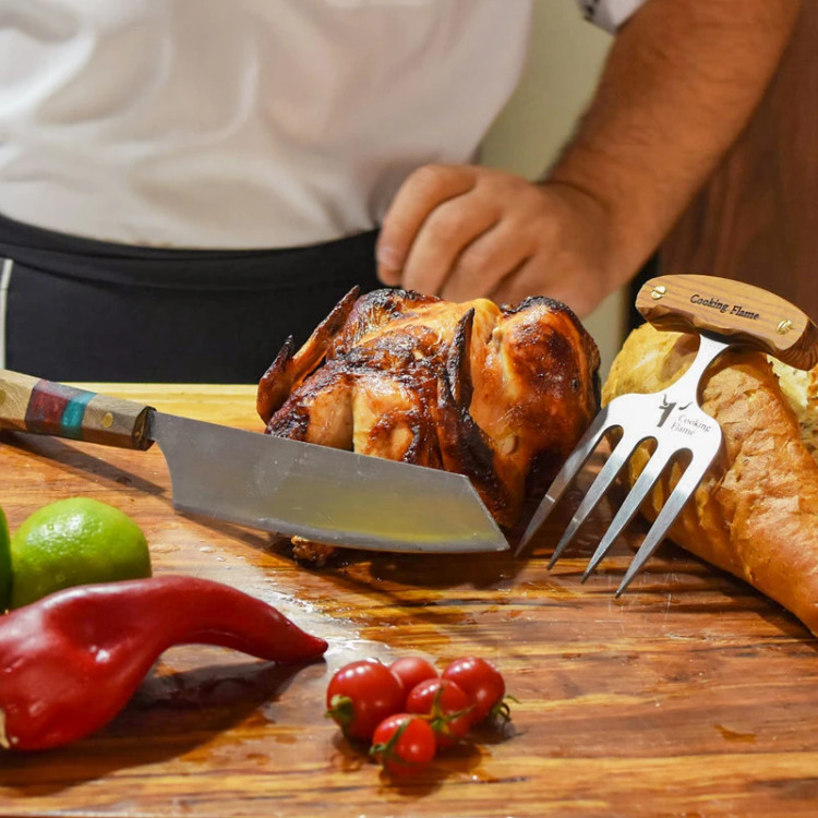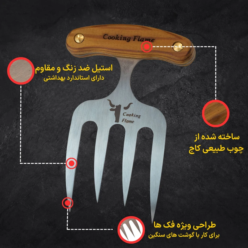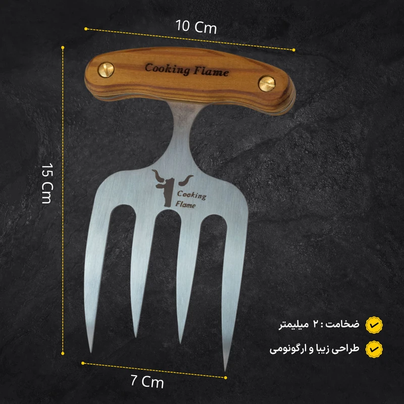 تجهیزات آشپزی علاوه بر کیفیت باید زیبا نیز باشند این شعار برند کوکینگ فلیم است در ساخت این چنگال از بروز ترین طراحی و بهترین متریال ها استفاده شده است. ابزارهای تخصصی مکمل یک آشپزی درست و خلاقانه است.و قطعا نداشتن امکانات در کیفیت ، سرعت و نتیجه نهایی تاثیر گذار خواهد بود. چنگال سرو منحنی با داشتن دندانهای نامتقارن برای سرو قطعات گرد بسیار مناسب است یکی دیگر از ابزارهای سرو گوشت چنگال سرو استیک و مرغ و گوشت است. زمانی که میهمانان دور میز ناهارخوری نشسته اند. بی شک، نحوه پذیرایی، سرو و اجرای مراسم شام، از دید تعداد زیادی از مردمانی که به زندگی لاکچری علاقه دارند؛ بسیار مهم است. این ابزار بی نظیر و عالی، به شما کمک می کند تا با نهایت اطمینان و خونسردی، زیباترین سرو را داشته باشید. تیغه محصول از استیل ضد زنگ ساخته شده که تا سال ها به خوبی روز اول کار میکند. جنس: دسته ازچوب کاج می باشد که به لطف ساخت دسته با این نوع متریال و هارمونی مناسب تیغه و دسته، قابلیت هندلینگ بسیار ایمن، جلوگیری از سر خوردن دست و جلوگیری از خستگی بیش از حد در حین استفاده طولانی مدت را داراست.