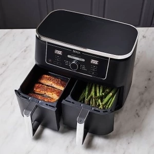 AF400 یکی از پرچمداران سرخ کن های نینجا بهشمار میآید که در دسته دستگاههای دوقلو قرار میگیرد و بالاترین توان مصرفی را ارائه میدهد. هر کدام از کاسههای سرخ کن نینجا AF400 دارای ظرفیت 4.75 لیتر هستند و پنل کنترل آن شامل چند دکمه و یک ولوم چرخشی است. توان مصرفی این دستگاه 2470 وات است و کاسههای آن نچسب و ضد خش هستند. سرخ کن نینجا AF400 قابلیت پخت مجزا در هر کاسه را دارد و نیز نمایشگر اعلام وضعیت غذای در حال پخت آنها نیز جداگانه است. این دستگاه خوشساخت دارای 6 برنامه پخت پرمصرف و پرکاربرد است و در مجموع پکیج کاملی از قابلیتها و ویژگیهای لازم را برای ارائه عملکردی ایدهآل و مناسب دارد دو محفظه پخت مستقل امکان آمادهسازی دو غذای متفاوت با دماها و زمانهای مختلف بهصورت همزمان. فناوری (DualZone) دو غذا، دو روش پخت – هر دو به صورت همزمان آماده میشوند! با استفاده از این فناوری، میتوانید برنامههای پخت، دما و زمانهای مختلف را برای هر بخش تنظیم کنید. ویژگی SYNC اطمینان میدهد که هر دو غذا به طور همزمان آماده سرو شوند. همچنین با استفاده از قابلیت MATCH میتوانید تنظیمات یکسانی را در هر دو بخش اعمال کنید. سرخکرده: 200 درجه سانتیگراد، 28 دقیقه کباب: 180 درجه سانتیگراد، 18 دقیقه ظرفیت فوقالعاده با کشوی 9.5 لیتری هر محفظه 4.75 لیتر (ظرفیت کل 9.5 لیتر)؛ مناسب برای پخت یک مرغ کامل 2 کیلوگرمی یا 1.4 کیلوگرم سیبزمینی سرخشده. پخت سریعتر و سالمتر تا 75٪ چربی کمتر و پخت تا 75٪ سریعتر نسبت به فرهای معمولی.