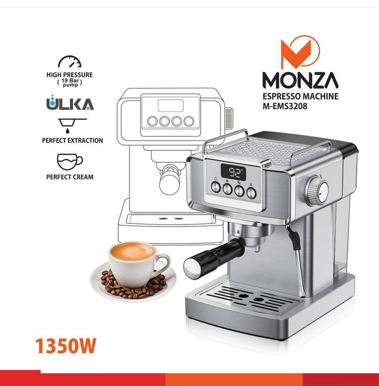 اسپرسو ساز مونزا مدل MONZA M-EMS3208 19 بار واقعی 1350 وات پمپ اولکا ایتالیا تمام استیل مخزن آب 1/8 لیتری اتومات دیجیتال بزرگ نشانگر لحظه ای دما پرتا فیلتر نیمه صنعتی بسکت دبل و سینگل صفحه گرمکن فنجان سینی چکه گیر نازل فوم و بخار یکسال ضمانت