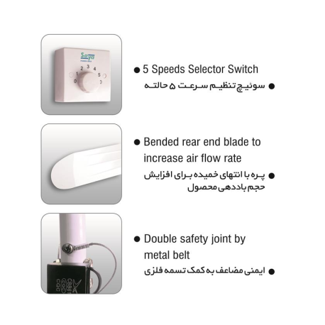 - داراي سوئيچ تنظيم دور 5 مرحله اي با امکان نصب روي ديوار و قابليت چرخش 180 درجه