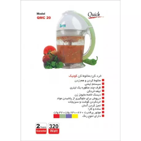 که در عین کاربرد فراوان، قابلیت شستشوی آسان و ایمنی و قدرت منحصر به فردی را دارامیباشد. واقعا این محصول شما را به حیرت ، تحسین و تعجب وا میدارد . اين محصول از دو قسمت تشکیل شده است ، قسمت فوقانی ( بالا) ، موتور و سایر قطعات الکتریکی و قسمت پایینی ظرف اصلی مواد غذایی که شامل ظرف اصلی / تیغه خرد کن / دیسک مخلوط کن و خامه زن و درپوش ظرف مي باشد. طریقه استفاده از محصول : ظرف اصلی را روی یک سطح صاف قرار دهید . تیغه ( اگر می خواهید مواد غذایی را خرد کنید ) یا دیسک مخلوط کن / خامه زن ( اگر قصد مخلوط کردن دارید) را روی میله وسط ظرف ( پین ) قرار دهید. مواد غذایی ( متناسب با عملکرد محصول ) را داخل ظرف بریزید . حال درپوش ظرف را روی ظرف اصلی قرار داده ، بدنه اصلی یا قسمت فوقانی محصول را روی ظرف گذاشته دکمه روشن / خاموش را فشار دهید . حال ملاحظه خواهید نمود دستگاه شما با چه قدرت خیره کننده ای مواد غذایی را خرد یا مخلوط می کند . این محصول قادر است 400 گرم انواع سوسیس / کالباس / گوشت / مرغ و ماهی را در 10 ثانیه خرد کند ( آن طوری که شما می پسندید ) شما می توانید در 10 ثانیه 500 گرم (گوجه فرنگی ، هویج ، کرفس ، خیار ، کاهو و کلم ) را با این محصول کاملا خرد کرده ، یعنی در 60 ثانیه سالادتان را آماده کنید و پیاز ، سیر و انواع سبزی را می توان در کمترین زمان خرد کرد . این محصول قادر است حدود 1000 میلی لیتر انواع مایعات مانند شیر و شربت ، انواع سس ، خامه و تخم مرغ را با استفاده از دیسک مخلوط کن / خامه زن در مدت 5 تا 20 ثانیه مخلوط کرده یا هم بزند. شما میتوانید یک فنجان خامه ، شکر و وانیل را در ظرف اصلی ریخته وپس از 10 ثانیه هم زدن حدود 700 گرم خامه سفت شده داشته باشید . حتي می توانید 10 عدد تخم مرغ را در ظرف اصلی ریخته و فقط 5 ثانیه برای هم زدن آن زمان بگذارید. باید گفت : - واقعا ارزش این محصول بسیار بیشتر از قیمت آن است - تا از این محصول استفاده نکرده اید ارزش آنرا درک نخواهید کرد - این محصول همه کاره آشپزخانه شما خواهد شد - جایگزین بسیاری از محصولات دیگر است اما خود جایگزینی ندارد. نکات ايمني بسیار مهم : 1- این محصول را بیش از 2 دقیقه به صورت متوالی روشن نگه ندارید و در صورت استفاده متوالی به مدت دو دقیقه ، حدود 5 دقیقه از روشن كردن آن خودداری نمایید. { هر چند این محصول در زیر 2 دقیقه آنچه می خواهید را در اختیارتان قرار خواهد داد.} 2- برای ایمنی بیشتر مصرف کننده در صورتيكه درپوش ظرف گذاشته نشود ، محصول روشن نخواهد شد . آیا می دانید : - موتور پرقدرت این محصول 500 وات توان داشته و چرخ دنده های روی موتور از مواد ضد سایش تشکیل شده اند و این امکان را به مصرف کننده می دهد که در کمترین زمان ،سخت ترین مواد غذایی را خرد نمايد - ظرف اصلی از موادي ساخته شده که در اثر ضربه شدید نمی شکند - شستشوی این محصول بسیار آسان بوده چون قطعات متعلقه آن فقط سه تکه است.