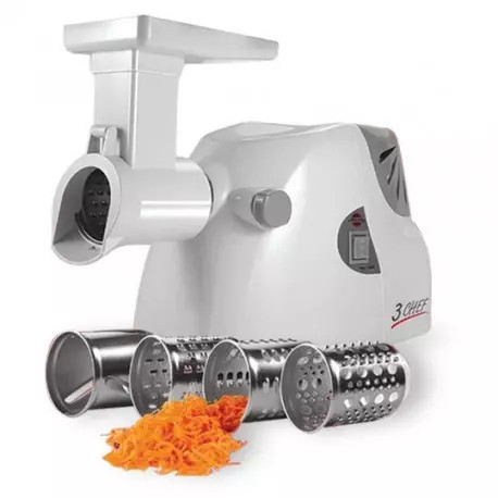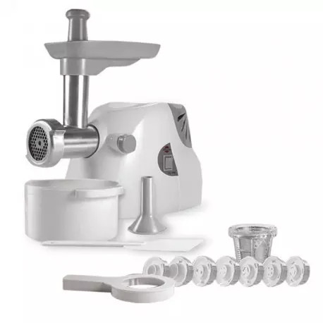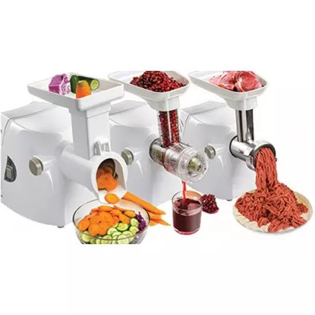 چرخ گوشت: خروجي 1200 گرم گوشت در دقيقه، مجهز به كليد برگردان (Reverse) (براي برگرداندن مواد غذايي باقيمانده در دستگاه بدون نياز به باز كردن چرخ گوشت)، دو عدد شبكه مخصوص گوشت چرخ كرده، قيمه و سبزي، قطعه سوسيس ساز، ظرف پلاستيكي جهت جمعآوري گوشت چرخ شده، محفظه نگهداري سيم و شبكه