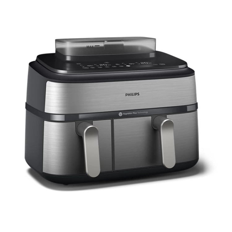 مدل NA555/09 از سری ۵۰۰۰ فیلیپس، دستگاهی دوکشویی با فناوری ترکیبی بخار و هوای داغ است که ظرفیت کلی آن حدود ۹ لیتر (۳ لیتر + ۶ لیتر) است. طراحی این محصول طوری است که توان پخت دو غذا با روشها و زمانهای متفاوت را بهطور همزمان فراهم میکند. در حالت کلی، RapidAir Plus اجازه میدهد هوای داغ بهطور یکنواخت دور غذاها گردش کند و سطح آنها ترد شود، در حالی که تکنولوژی Air Steam باعث میشود بخار به بافت غذا نفوذ کرده و رطوبت را حفظ کند. این ترکیب باعث میشود هم غذایی سالمتر داشته باشید و هم عملکرد بالا، پخت دقیقتر و طعم طبیعی حفظ شود. ظاهر براق و صفحهنمایش دیجیتال لمسی طراحی مدرن همراه با دستههای ارگونومیک، استفاده آسان را تضمین میکند. همچنین وجود قابلیت Sync Time برای هماهنگکردن زمان پخت سبدها، تجربه آشپزی را هوشمندانهتر کرده است. در مجموع، NA555/09 یک محصول حرفهای است که همراه با امکانات جدید پخت، تجربهای متفاوت از هواپز را ارائه میدهد.