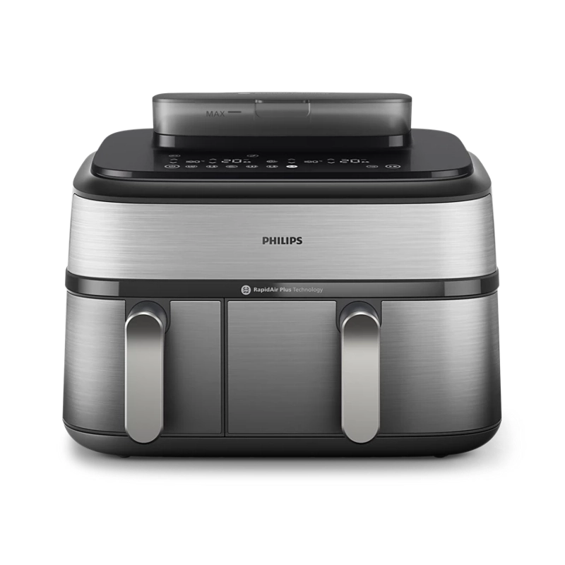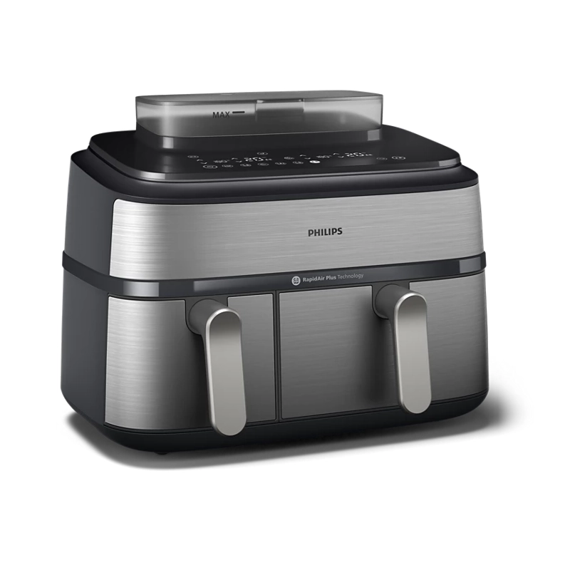 مدل NA555/09 از سری ۵۰۰۰ فیلیپس، دستگاهی دوکشویی با فناوری ترکیبی بخار و هوای داغ است که ظرفیت کلی آن حدود ۹ لیتر (۳ لیتر + ۶ لیتر) است. طراحی این محصول طوری است که توان پخت دو غذا با روشها و زمانهای متفاوت را بهطور همزمان فراهم میکند. در حالت کلی، RapidAir Plus اجازه میدهد هوای داغ بهطور یکنواخت دور غذاها گردش کند و سطح آنها ترد شود، در حالی که تکنولوژی Air Steam باعث میشود بخار به بافت غذا نفوذ کرده و رطوبت را حفظ کند. این ترکیب باعث میشود هم غذایی سالمتر داشته باشید و هم عملکرد بالا، پخت دقیقتر و طعم طبیعی حفظ شود. ظاهر براق و صفحهنمایش دیجیتال لمسی طراحی مدرن همراه با دستههای ارگونومیک، استفاده آسان را تضمین میکند. همچنین وجود قابلیت Sync Time برای هماهنگکردن زمان پخت سبدها، تجربه آشپزی را هوشمندانهتر کرده است. در مجموع، NA555/09 یک محصول حرفهای است که همراه با امکانات جدید پخت، تجربهای متفاوت از هواپز را ارائه میدهد.
