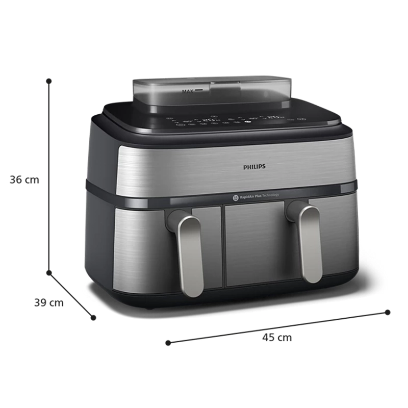 ابعاد دستگاه حدود ۴۴ × ۳۸ × ۳۵ سانتیمتر و وزن حدود ۸.۷ کیلوگرم است که با وجود طراحی دو محفظهای، اشغالی نسبتاً منطقی روی کانتر دارد. ظرفیت کل ۹ لیتر امکان قرار دادن مرغ کامل (حدود ۱.۲ کیلوگرم) در سبد بزرگ یا بیش از ۱۰۰۰ گرم سیبزمینی را فراهم میکند. این ابعاد سازگار با خانوادههای ۴ تا ۶ نفره است. بدنه بخشی از طراحی Coolwall دارد که در حین کار گرم نمیشود و لمس بیرونی دستگاه ایمن است. دستهها و سبدها آسان جدا میشوند، مما موجب راحتی در تمیزکاری و جابهجایی میگردد. با توجه به حجم مناسب و ساختار ارگونومیک، این سرخکن برای آشپزخانههای متوسط تا بزرگ و مصرف خانوادههای پرجمعیت یک گزینه کارآمد و بهجا است.