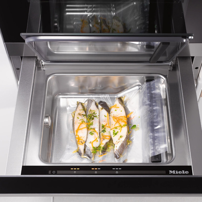 برای تکنیک پخت سووید ضروری است: در کشوی داخلی وکیوم، مواد غذایی وکیوم شده و در دمای پایین و ثابت آماده میشوند. |